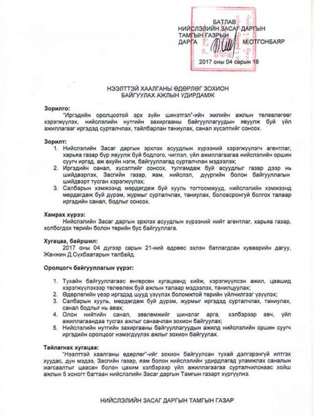 Нийслэлийн Засаг даргын Тамгын газраас 2017 оныг “Иргэдийн оролцоотой эрх зүйн шинэтгэлийн жил” болгон зарласан. Тус ажлын төлөвлөгөөг хэрэгжүүлэх, нийслэлийн нутгийн захиргааны байгууллагуудын явуулж буй үйл ажиллагааг иргэдэд сурталчлах, тайлбарлан таниулах, санал хүсэлтийг сонсох зорилгоор энэ сарын 21-ний өдрөөс эхлэн Д.Сүхбаатарын талбайд нээлттэй хаалганы өдөрлөг зохион байгуулахаар болоод байна.