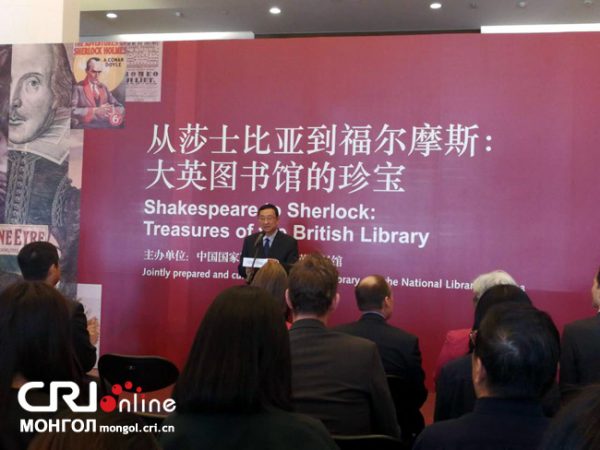 Энэ жил Хятад, Их Британи хоёр улс дипломат харилцаа тогтоосны 45 жилийн ой тохиож, “Шекспирээс Шерлок Холмс хүртэл Их Британийн номын сангийн нандин эрдэнэ” хэмээх үзэсгэлэн 4-р сарын 21-нээс Хятадын үндэсний номын санд албан ёсоор нээгдсэн юм. Их Британийн номын сангийн сан хөмрөг дэх Шекспир, Байрон, Дикенс, Артур Конан Дойл зэрэг Английн уран зохиолын ноён оргилуудын гар бичмэл, эртний ховор нандин ном хэвлэлийг Хятадад анх удаа үзүүлж байна. Мөн Шекспиртэй нэг цаг үед амьдарч байсан Хятадын жүжгийн зохиолч Тан Шяньзүгийн “Мү Дань Тин” буюу “Удвал цэцгийн тагт” зохиолын он дамжсан хуулбарыг үндэсний номын санд тавьсан тул өрнө, дорны хоёр аугаа зохиолчийн сонгодог бүтээл нэг дор тавигдаж, “нэг цаг үед өөр өөр соёлыг харьцуулж үзэх” боломж олгосон байна. Энэ тухай ХОУР-ийн сэтгүүлч Ван Хэншиний ирүүлсэн мэдээ