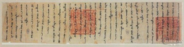 -“Мөнх тэнгэрийн хүчин дор. Бүх аугаа их ард иргэдийн далай хааны зарлиг /энэ хэдэн мөрийг Туркээр бичсэн байна/ Зарлигийг минь шашны их хаан ухаартугай. Караль хэмээх газар хурилдай хийж ахуйд танай элч томилон гуйчилбай! Гуйчиллыг чинь илчээс чинь сонсвой! Тар нар хэрвээ өөрийн хэлсэн үгэндээ суух болбоос шашны их хаан чи биеэр ирж, бидэн лүгээ учрах хэрэгтэй. Бид нар та нарт засагт /хуульд/ дурдсан зарлиг бүхнийг сонсогосугай. Бас надад сайн ёсыг хүлээлгэх нь сайн явдал хэмээн та нарт хэлэв.