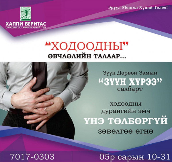 “Хаппи Веритас” эмчилгээ оношлогооны төв, ХСҮТ, МЗХ-ны Эрүүл мэндийн хороо хамтран “Ходоодны хорт хавдаргүй Монгол” аяныг эхлүүлж байгаа юм байна. Аяны хүрээнд 2017 оны 5-р сарын 10-ны өдрөөс эхлэн 20 хоногийн хугацаанд хелико бактер тодорхойлох шинжилгээг 80 хувийн хөнгөлөлттэй үнээр буюу 1000 төгрөгөөр хийх юм.