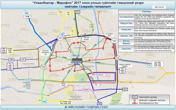 “Улаанбаатар марафон-2017” олон улсын гүйлтийн тэмцээний үеэр зохион байгуулах үйл ажиллагааны хүрээнд Бага тойруу, Энхтайваны өргөн чөлөө, Баруун 4 замын уулзвараас Зүүн 4 зам хүртэлх авто зам, Сөүлийн гудамж, Бээжингийн гудамж, Анкарагийн гудамж, Самбуугийн гудамжны авто замын хөдөлгөөнийг хязгаарлах тул дээрх гудамж, авто замаар үйлчилгээ үзүүлдэг нийтийн тээврийн 34 чиглэлийн 331 тээврийн хэрэгслийн чиглэл, замналд өөрчлөлт оруулж байна. Тодруулбал, хотын төвийн буюу Их тойруу доторх гол гудамж, замууд хаагдах үед нийтийн зорчигч тээврийн үйлчилгээний чиглэлүүд хойгуураа Их тойруугийн гудамж, урдуур Нарны зам, Намъяанжугийн гудамжаар явах бөгөөд хойноос урагш болон урдаас хойш явдаг босоо чиглэлүүд Баруун 4 зам, Нарны гүүр, Зүүн 4 замаар үйлчилнэ.