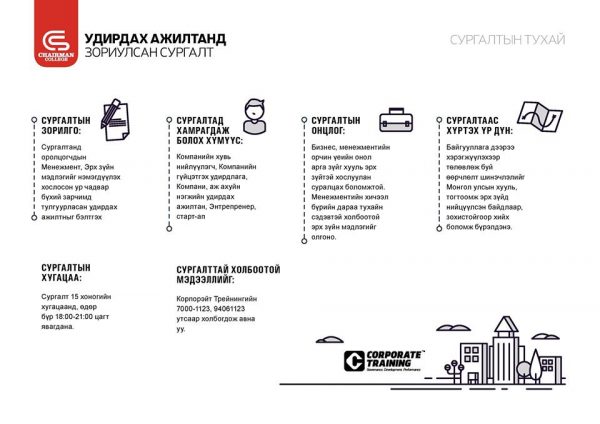 Компанийг зөв удирдлагаар хангах үндсэн үүрэг бүхий УДИРДАХ АЖИЛТАН ТАНД зориулан “Корпорэйт трейнинг” компаниас зохион байгуулж буй “Chairman college” сургалтын талаарх мэдээллийг 7000-1123, 94061123 утсаар холбогдож авах боломжтой.