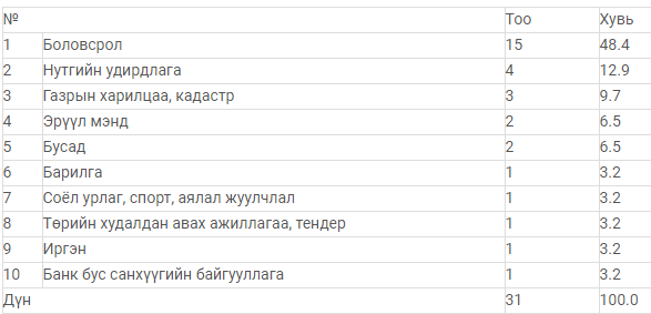 Гомдол, мэдээлэл нь агуулгын хувьд 14 нь ашиг сонирхлын зөрчилтэй гэх, 6 нь төрийн байгууллагын ёс зүй, хүнд суртал, удирдах ажилтны гаргасан шийдвэртэй холбоотой байсан бол гэмт хэргийн шинжтэй 3 гомдол, мэдээлэл ирүүлсэн байх ба харьяаллын бус 8 гомдол, мэдээллийг зохих байгууллагад нь шалгуулахаар шилжүүлсэн байна. Гомдол мэдээллийг салбар, байгууллагаар нь авч үзвэл боловсрол, нутгийн удирдлага, газрын харилцаа, кадастртай холбоотой гомдол, мэдээлэл харьцангуй олон иржээ. Тухайлбал Нийслэлийн 122-р сургууль, 6-р сургууль, Ирээдүй цогцолбор, 35 дугаар сургууль, 22 дугаар сургууль, Дорнод аймгийн 5 дугаар сургууль, 12 дугаар цэцэрлэг, Баянзүрх дүүргийн 129-р цэцэрлэг, Сонгинохайрхан дүүргийн 12 дугаар сургууль зэрэг боловсролын байгууллагатай холбоотой, Баян-Өлгий, Архангай, Баянхонгор аймгийн Засаг даргын тамгын газрын албан тушаалтан, Увс, Дундговь, Хэнтий аймгийн сумдын төрийн албан хаагчидтай буюу нутгийн удирдлагатай холбоотой, Сонгинохайрхан дүүргийн газрын албаны албан хаагчдын ашиг сонирхлын зөрчил гаргасан гэх газрын харилцаатай холбоотой гомдол мэдээллүүд цөөнгүй ирүүлсэнийг хүлээн авч, хянан шалгаж байна.