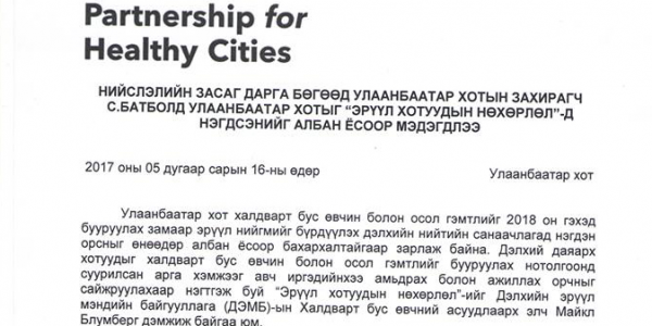 Нийслэлийн Засаг дарга бөгөөд Улаанбаатар хотын Захирагч С.Батболд өнөөдөр халдварт бус өвчин, осол гэмтлийг 2018 он гэхэд бууруулах замаар эрүүл нийгмийг бүрдүүлэх дэлхийн нийтийн санаачлагад Улаанбаатар хот нэгдсэнийг албан ёсоор мэдэгдлээ. “Эрүүл хотуудын нөхөрлөл”-д нэгдсэнээр халдварт бус өвчин болон осол гэмтлийг үүсгэх эрсдэлт хүчин зүйлсийг бууруулах нотолгоонд суурилсан арга хэмжээг авч иргэдийнхээ амьдрах болон ажиллах орчныг сайжруулах юм гэж нийслэлийн Эрүүл мэндийн газраас мэдээллээ.