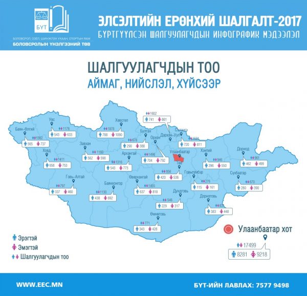 ЭЕШ-д бүртгүүлсэн нийт шалгуулагчдын тоог хүйсээр нь авч үзвэл 18435 нь эрэгтэй, 21953 нь эмэгтэй байна. Түүнчлэн шалгуулагчдын 17499 нь Улаанбаатар хотод бүртгүүлсэн бол 22889 шалгуулагч хөдөө орон нутгаас бүртгүүлсэн байна.