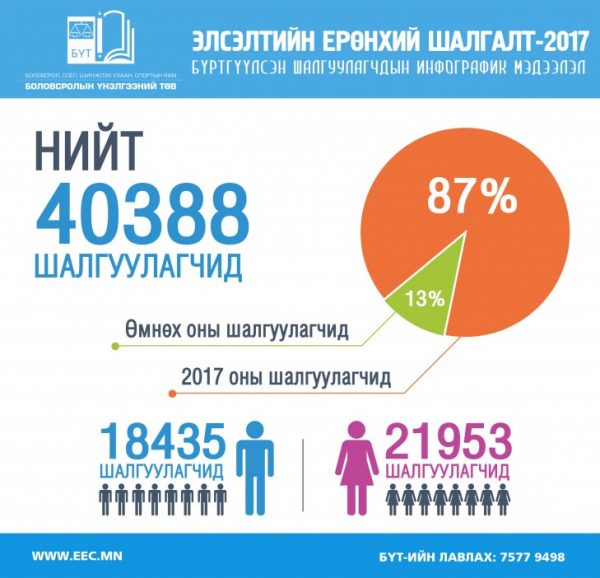 Монгол хэл бичгийн болон ЭЕШ–ын шалгуулагчдын бүртгэл орон даяар 2017 оны 02 дугаар сарын 01-ны өглөө 09:00 цагт эхэлж, 4 дүгээр сарын 14-ны орой 18:00 цагт дууссан. Энэ онд нийт 40388 шалгуулагчид ЭЕШ-д бүртгүүлжээ. Үүний 87 хувь нь 2017 онд ЕБС төгсөж байгаа шалгуулагчид, 13 хувь нь өмнөх оны шалгуулагчид байна.