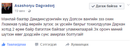 Энэ тухайгаа Д.Дагвадорж цахим хуудсандаа “Манлай баатар Дамдинсүрэнгийн хүү Долсон вангийн зээ охин Лхамжав гуайд өөрийн зүгээс эх үрсийн баярыг тохиолдуулан Дархан хотод 2 өрөө байр бэлэглэж байгааг уламжлаарай. Эх оронч миний шүтээн өвөг дээдсийн сүнс амирлах болтугай” гэж бичжээ.