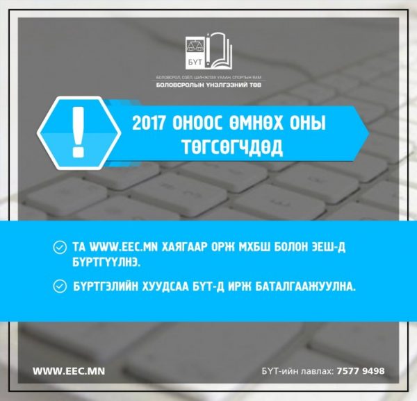2017 оноос өмнөх онуудад ерөнхий боловсролын сургууль төгссөн шалгуулагчид 2017 оны 06 сарын 10-аас өмнө Боловсролын үнэлгээний төв болон шалгалт өгөх аймгийн ЭЕШ хариуцсан мэргэжилтнээр бүртгэлийн хуудсаа баталгаажуулахыг анхааруулж байна. Мөн та бүхэн  бүртгэлийн дугаар, нууц үгээ ашиглан шалгуулагчийн булангаар нэвтэрч хувийн мэдээлэл гэсэн хэсгээс суудлын хуваариа хэвлэж аваарай.