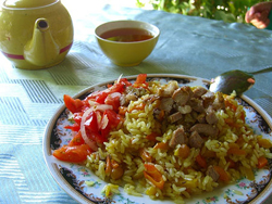 -Будаан дээрээ тахианы шөлөө хийж карри, давсаа нэмээд саваа таглаж зөөлөн гал дээр 30 минут чанана. Сонгиноо арилгаж жижиг хэрчинэ.