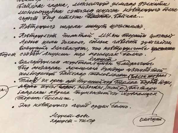 2010 онд “Монгол Тулгатны 100 эрхэм” хэмээх төслийг санаачлан эхлүүлж, Хэро-г гүйцэтгэгч байгууллагаараа авч, их хэмжээний хөрөнгө оруулалт хийж ажлаа эхлүүлж байлаа. Их үйлийн дэргэд бага зүйл байх аа, гэхдээ “би” энэ төслийг зориг шулуудан хийсэн юм. “Би” хэзээд бид хэмээсээр ирсээн. Гэхдээ өнөөдөр, үнэнийг өгүүлэх энэ мөчид “Би” хэмээн зоригтой дуугарч байна! Чи муу юу хийсэн юм хэмээн элдвээр дайруулан балбуулж ирэхдээ, тэнгэр шиг бай хэмээх Балбар агсны шүлгээр хань хийж, доромжлох тусам долоон бурхан од шиг гялалз хэмээх түүний үгийг ухан боддог. Амьд нь хань болохоосоо илүү хазаж хайрдаг болсон энэ аймшигт цагт тэртээ тэнгэрийн орноо зорьсон их хүмүүний амьд орших энэ үгс дэм болж, чигийг заан ирлээ! Ардын уран зохиолч Б. Лхагвасүрэн гуайг урьж, хамт хөтлөхийг зөвшөөрсөн хүн нь “би” юм. Энд нэгэн бичвэрийг хавсаргалаа! Лхагвасүрэн гуайн гар бичмэлд, намайг энэ нэвтрүүлгийг бодож сэдсэн Анужин хэмээн бичсэн буй.