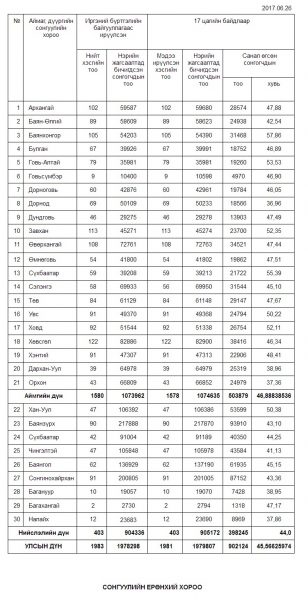Улсын хэмжээнд 45.57 хувийн ирцтэй байна.