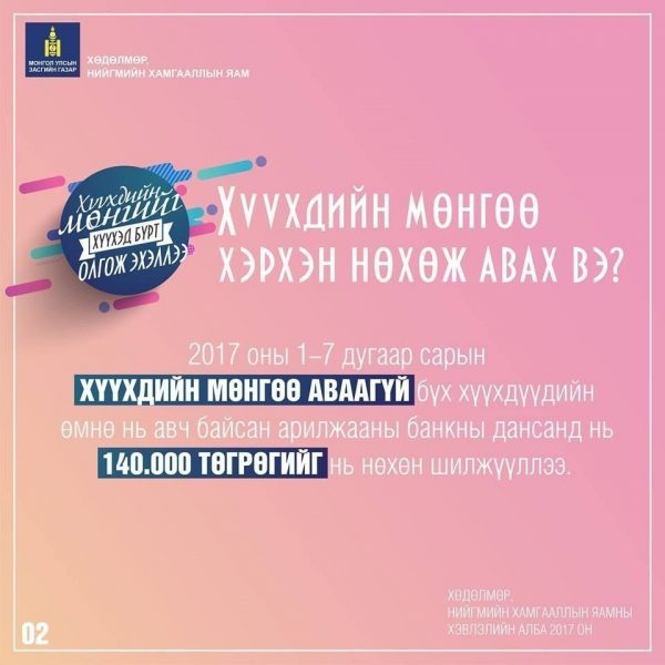 Өчигдрөөс эхлэн иргэдийн данс руу хүүхдийн мөнгийг шилжүүлж эхэлжээ. Энэ талаар Хөдөлмөр нийгмийн хамгааллын яамны мэргэжилтэн дараах тайлбарыг өглөө. “Таны хүүхэд урьд нь хүүхдийн мөнгө авч байсан бол гэрээт банкин дахь дансанд нь мөнгө орсон байх болно. Харин шинээр төрсөн хүүхдээ бүртгүүлж амжаагүй бол эх, эцгийн иргэний үнэмлэх, хүүхдийнхээ төрсний гэрчилгээний хамт банкинд бүртгүүлж, дансаа нээлгэснээр хүүхдийнхээ мөнгийг авна” гэж  мэдээллээ.