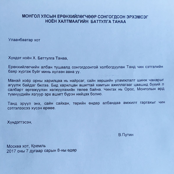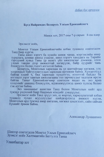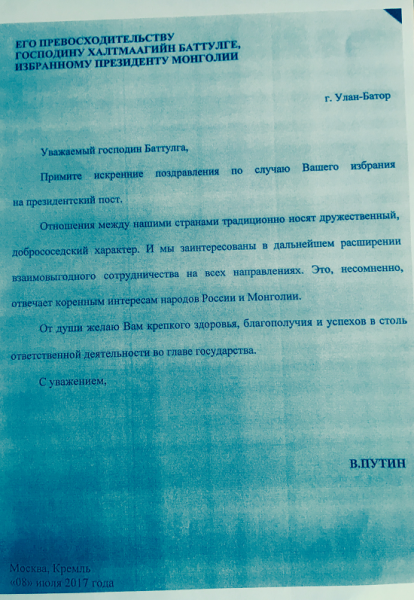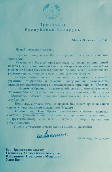 Монгол Улсын тав дахь ерөнхийлөгчөөр сонгогдсон Халтмаагийн Баттулгад ОХУ-ын ерөнхийлөгч Владимир Путин болон Бүгд Найрамдах Беларусь улсын ерөнхийлөгч Александр Лукашенко нар баяр хүргэж мэндчилгээ ирүүлснийг бүрэн эхээр нь хүргэж байна.