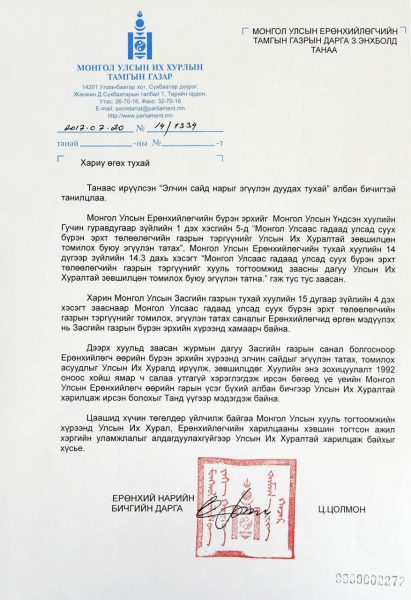 Цаашид хүчин төгөлдөр үйлчилж байгаа Монгол Улсын хууль тогтоомжийн хүрээнд Улсын Их Хурал, Ерөнхийлөгчийн харилцааны хэвшин тогтсон ажил хэргийн уламжлалыг алдагдуулахгүйгээр Улсын Их Хуралтай харилцаж байхыг хүсье” гэжээ хэмээн Улсын Их Хурлын Хэвлэл мэдээлэл, олон нийттэй харилцах хэлтсээс мэдээлэв.