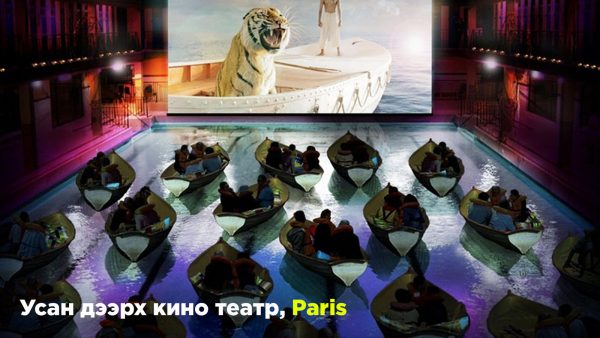 Үзэсгэлэнт Парис хотын усан сан дахь кинотеатрт завин дээр хайртай дотны хүнтэйгээ суун кино үзэхэд яг л сувдан тэнгисээр аялж буй мэт байна гэдэгт эргэлзэх хэрэггүй биз.