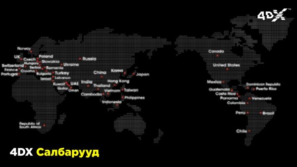 Өнөөдрийн байдлаар АНУ, Япон, Солонгос, Орос, Хятад гээд дэлхийн 42 оронд буюу Монголоос бусад Азийн бүх оронд салбартай 4DX нь кино хорхойтнуудын жинхэнэ мөрөөдлийн газар болоод байгаа аж.