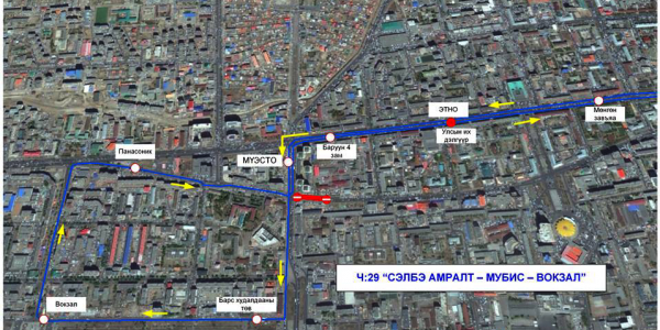 Зам хаагдахтай холбогдуулан нийтийн тээврийн үйлчилгээний Ч:29 “СЭЛБЭ АМРАЛТ-МУБИС-ВОКЗАЛ” чиглэлийн замналд түр хугацаанд өөрчлөлт орно. Чиглэлийн замналыг дараах зурагт харуулав гэж нийслэлийн Тээврийн газраас мэдээллээ.