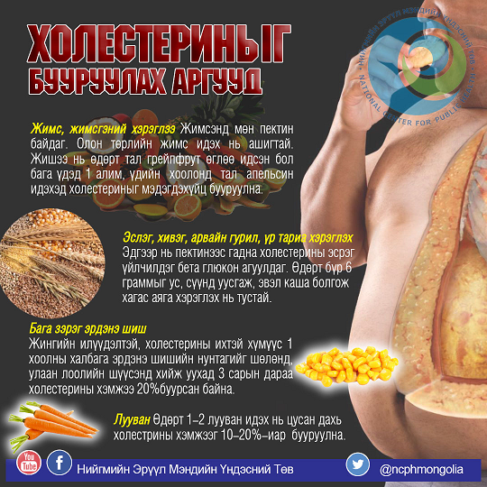 Эслэг, хивэг, арвайн гурил, үр тариа хэрэглэх:Эдгээр нь холестерины эсрэг үйлчилгээ үзүүлдэг. Өдөр бүр 6 граммыг ус, сүүнд уусгаж эсвэл каша болгож хагас аяга хэрэглэх нь тустай.