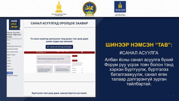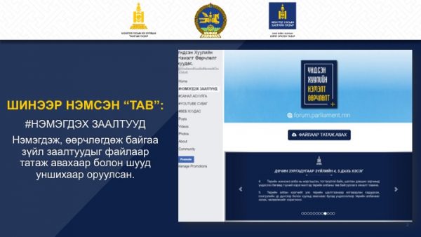 Мөн албан ёсны санал асуулга бүхий forum.parliament.mn хуудас руу дамжин нэвтэрч, тэнд хэрхэн бүртгүүлж, бүртгэлээ баталгаажуулах, санал өгөх талаар дэлгэрэнгүй зурган тайлбарыг оруулсан байна.