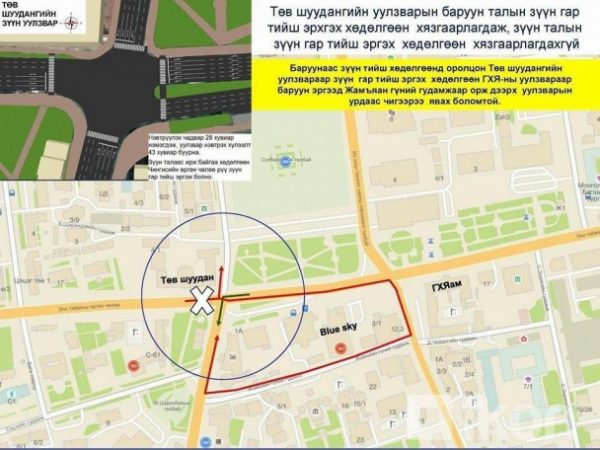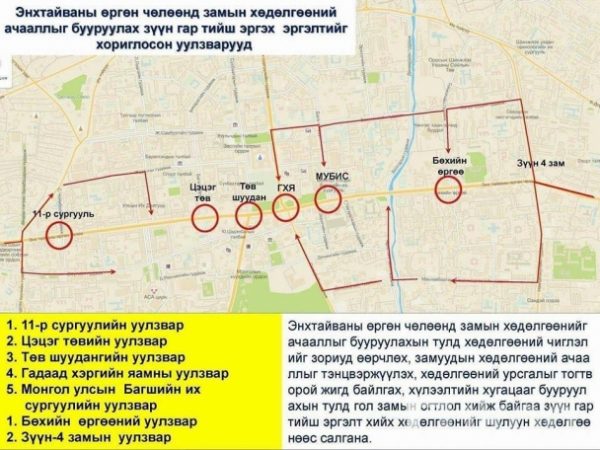 Энэ сарын 15-н буюу маргаашнаас эхлэн нийслэлийн төв зам буюу баруун 4 замаас зүүн 4 хүртэл зүүн гар тийш эргэхийг хориглож байгаа. Учир нь тус замын хооронд зүүн гар тийш эргэснээс болж түгжрэл их үүсдэг хэмээн албаны хүмүүс үзэж байгаа аж. Тиймээс энгийн богино хугацаатай болгохын тулд гол замаас зүүн гар тийш эргэх хөдөлгөөнийг хязгаарлаж, туслах зам руу шилжүүлэх шаардлага тулгарч буй юм. Ингээд зүүн гар тийш эргэхийг хориглосон уулзваруудыг танилцуулж байна.