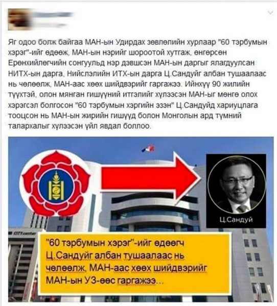 Өнөөдөр МАН-ын Удирдах зөвлөлийн хурал болж байгаа. Энэ хурлаас тус намын дотоодод үүсээд байгаа асуудал нэг тийшээ болж, ялангуяа “60 тэрбумын хэрэг”-ийг намын удирдлагууд хэлэлцэнэ гэж найдаж буй иргэд цөөнгүй байсан. Тэгвэл “60 тэрбум”-ын асуудалд хамгийн ихээр нэр холбогдсон Ц.Сандуйд намынхан нь хариуцлага тооцож, намаасаа хөөх шийдвэр гаргажээ гэх мэдээлэл нийгмийн сүлжээгээр тарах болов.