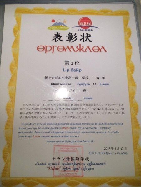 Япон улсын Парламентын 70 жилийн ойг тохиолдуулан Парламентын дээд танхимаас зохион байгуулсан ”Хэрвээ би УИХ-ын гишүүн болвол” сэдэвтэй 4000 ханз болон үсгээс бүрдсэн эссэ бичлэгийн уралдаанд нийт 1874 ахлах ангийн сурагчид оролцжээ. Тус уралдаанд Улаанбаатар хотын Баянзүрх дүүргийн “Шинэ Монгол” ахлах сургуулийн 12-р ангийн сурагч Б.Хангай тэргүүн байр эзлэн, Японы Парламентын дээд танхимын дарга Датэ Чюуичигийн урилгаар Япон улсыг зорин тэргүүн байрын шагналаа гардан аваад эх орондоо ирсэн байна.