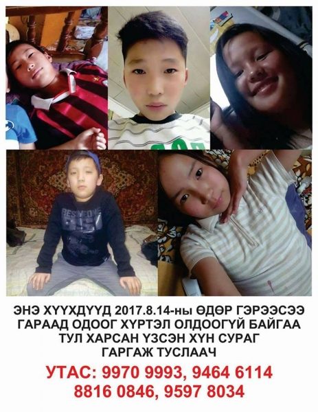 Наймдугаар сарын 14-ний өдрийн 15.00 цагийн орчимд тоглохоор гэрээсээ гарсан 12-15 насны хоёр эмэгтэй, гурван эрэгтэй хүүхэд сураггүй алга болжээ. Тодруулбал, Чингэлтэй дүүргийн 14 дүгээр хороо 5 буудал орчмоос 10 настай эрэгтэй З.Ууганбаяр, найман настай, эрэгтэй З.Отгонбаяр, 12 настай эмэгтэй А.Энхгэгээрэл болон бусад хоёр охин хамт тоглохоор гарсан байна. Хүүхдүүдийг алга болсныг цагдаад мэдэгдсэнээс хойш 96 цаг болж байгаа аж.