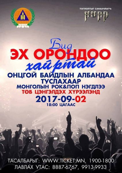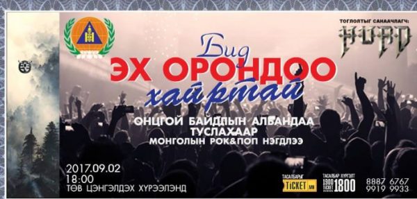 “Бид эх орондоо хайртай” тоглолт 2017 оны 09 дүгээр сарын 02-ны 18:00 цагаас Төв цэнгэлдэхэд болох юм гэж Онцгой байдлын ерөнхий газраас мэдээллээ.