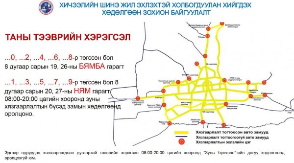Хичээлийн шинэ жил эхэлж байгаатай холбогдуулан Нийслэлийн Засаг дарга бөгөөд Улаанбаатар хотын Захирагч С.Батболд захирамж гаргаж, замын хөдөлгөөний түгжрэл, ачааллыг бууруулах зорилгоор хөдөлгөөнийг дараах байдлаар зохицуулалт хийхээр шийдвэрлэсэн. Уг шийдвэрийн дагуу Тэгш тоогоор буюу 0, 2, 4, 6, 8-р төгссөн автомашин 8-Р САРЫН 19,26 –ны Бямба гарагуудад, Сондгой тоогоор буюу 1, 3, 5, 7, 9-р төгссөн автомашин 8-Р САРЫН 20,27-ны Ням гарагуудад 08:00-20:00 цагийн хооронд зуны хязгаарлалтын бүсэд замын хөдөлгөөнд оролцоно гэдгийг Замын цагдаагийн албанаас мэдээлж байна.