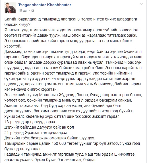 Тэгвэл энэ талаар Монгол Улсын Гавьяат тамирчин, Хөдөлмөрийн баатар Х.Цагаанбаатар өөрийн цахим хуудсаараа дамжуулан сэтгэгдлээ илэрхийлжээ.
