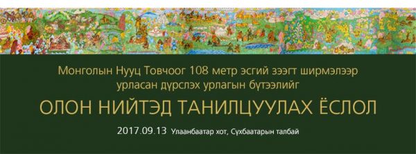 Монгол Улсын 21 аймгийн 5000 гаруй урлаач, үйлчид 2015 оны 12 сарын 28-наас 2017 оны 3 сарын 12-ийг хүртэлх хугацаанд бүтээсэн бөгөөд уг бүтээлийг урлах явцад 4000 гаруй хүмүүст зээглэн ширэх оёдлыг зааж сургасан ажээ. Энэхүү дүрслэх урлагийн бүтээлийг урлах үйл ажиллагаанд Монголчууд төдийгүй Өвөрмонгол, Тува, Буриад, Халимаг, Киргиз зэрэг монгол туургатнууд хамрагдсан бөгөөд уг бүтээлд 108 метр цагаан эсгий, 2000 км зээг, 20000 км метр тэмээний утас, 120 ширхэг тэвнэ, 120 ширхэг зүү, 32 өнгийн 100 гаруй литр будаг, 288 метр нягтруулагч таар, 110 метр цагаан даавуу оржээ.