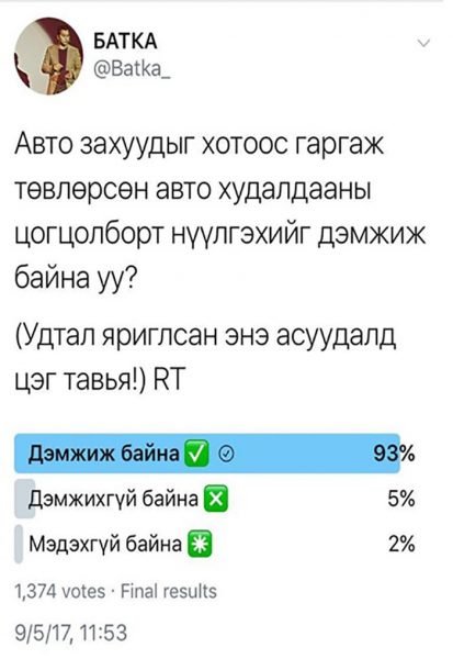 Мөн сошиал ертөнцөд өөрийн гэсэн орон зайг хэдийн бий болгосон Батка хэмээх залуу твиттер хуудсаа ашиглан 1374 твиттер ашиглагчийн судалгаа явуулахад, судалгаанд оролцогчийн 93% нь авто худалдааны төвүүдийг хотоос гаргаж төвлөрсөн авто худалдааны цогцолборт нүүлгэхийг дэмжиж байгаагаа илэрхийлсэн байна.