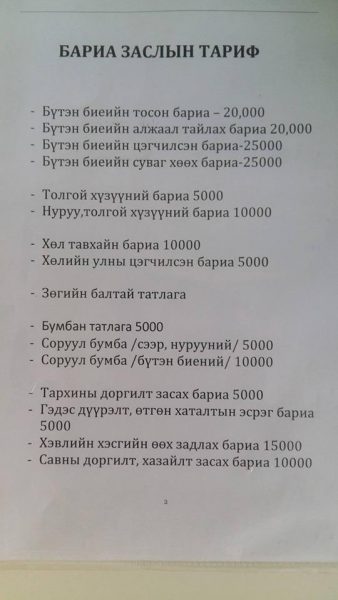 Тус бариа заслын газарт очсоноор бүтэн биеийн алжаал тайлах бариа, бумба, хэвлийн хэсгийн өөх задлах , савны доргилт, хазайлт, хөлийн улны цэгэн бариа зэргийг хийлгэх боломжтой юм.