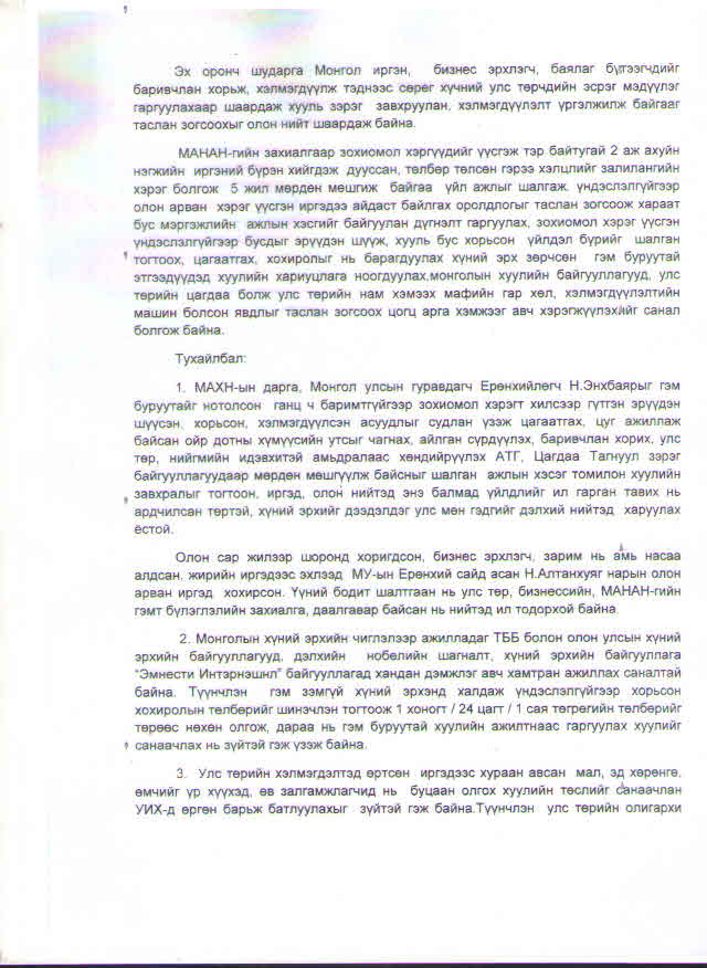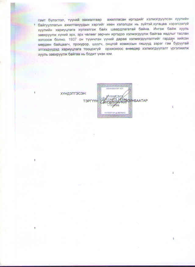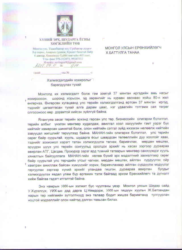 Монгол улсын Шадар сайд асан Ц.Оюунбаатарын тэргүүлдэг “Хүний эрх, шударга ёсны хөгжлийн төв” ТББ-ын зүгээс Монгол улсын Ерөнхийлөгч Х.Баттулгад хандан хэлмэгдэгсдийн хохирлыг барагдуулах тухай хүсэлтийг албан бичгээр илгээснийг бүрэн эхээр нь хүргэж байна.