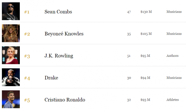 Жил бүр Форбес сэтгүүлээс уламжлан зохион байгуулдаг хамгийн баян алдартнуудын эгнээг Реппер “Diddy” 130 сая долларын хөрөнгөөр тэргүүллээ. Тухайн жилийн хамгийн ашиг орлоготой алдартнуудыг тодруулдаг тус сэтгүүл 1917 онд үүсгэн байгуулагдаж байжээ. Түүнээс хойш дэлхийн хэмжээнд урлаг соёл, бизнес бүхий л салбарын хүрээнд тэргүүлсэн хүмүүсийн жагсаалтыг гаргадаг юм. Тэгвэл өнгөрсөн жил жагсаалтыг Харри Поттер номын зохиолч Ж.Р Роулинг 90 сая ам долларын хөрөнгөөр тэргүүлж байсан бөгөөд хоёрдугаар байранд Дуучин Драке нар бичигдэж байсан. Удаах байранд дуучин Бейонсе 105 сая долларын хөрөнгөөр бичигдлээ. “Diddy” энэ жил “Bad Boy Reunion Tour” нэртэй аялан тоглолт хийж, “Ciroc” архины брэндийн сурталчилгаанд оролцож, мөн өөрийн Sean John хувцасны брэндээ амжилттай хөгжүүлсэн нь ийнхүү Forbes-ын хамгийн өндөр орлоготой алдартнуудын жагсаалтыг тэргүүлэхэд хүргэсэн байна. Мөн жагсаалтад анх удаа дуучин Weeknd хүч төрж орж ирлээ. Тэрээр жагсаалтын зургаадугаар байранд бичигдсэн байна.