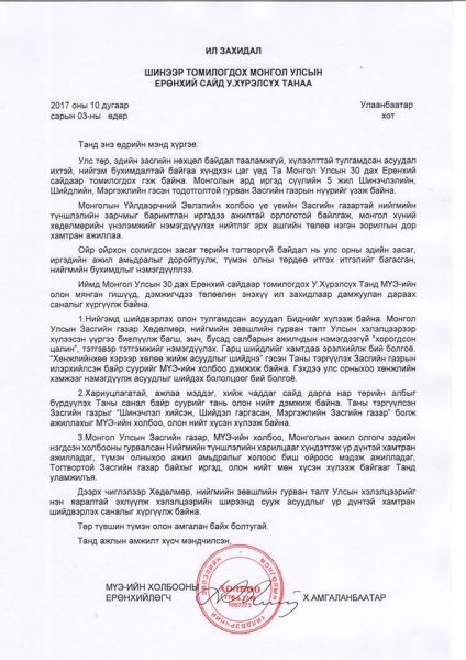 Монголын Үйлдвэрчний Эвлэлийн холбооны ерөнхийлөгч Х.Амгаланбаатар шинээр томилогдох Монгол Улсын 30 дахь Ерөнхий сайд У. Хүрэлсүхэд хандан ил захидал илгээснийг бүрэн эхээр нь хүргэж байна.