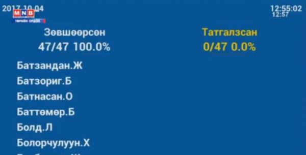 Ийнхүү УИХ-ын намрын чуулганд оролцсон нийт 47 гишүүдийн 100 хувийн саналаар Монгол Улсын 30 дахь Ерөнхий сайдаар Ухнаагийн Хүрэлсүх сонгогдлоо.Монгол Улсын 30 дахь Ерөнхий сайдаар сонгогдсон У.Хүрэлсүхийн намтрыг танилцуулж байна.