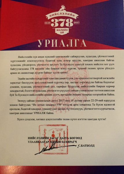 Нийслэл хот үүсч байгуулагдсаны 378 жилийн ойн баярыг угтан Нийслэлийн Засаг дарга бөгөөд Улаанбаатар хотын Захирагч С.Батболд, НЗД-ын Нийгмийн хөгжлийн асуудал хариуцсан орлогч Ш.Анхмаа, НЗД-ын Ногоон хөгжил, агаарын бохирдлын асуудал хариуцсан орлогч Ж.Батбаясгалан, НЗД-ын Ядуурлыг бууруулах, хөдөлмөр эрхлэлтийн асуудал хариуцсан орлогч Д.Энхтөр, НЗДТГ-ын дарга М.Отгонбаяр нар “Зочин” уулзалтаараа нийслэлд үйл ажиллагаа явуулж байгаа худалдаа үйлчилгээний төвүүдийн удирдлагууд, төлөөлөлтэй уулзлаа.