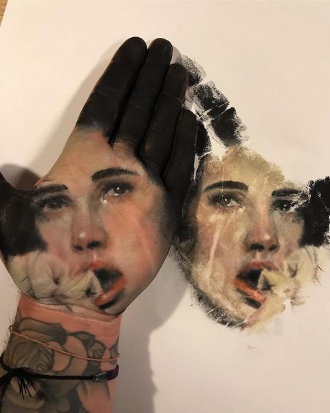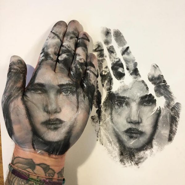 Калифорни мужийн зураач Рассел Пауэл хөрөг зургийн тогтсон ойлголтыг эвдсэн уран бүтээл туурвижээ. Тэрээр зургаа нойтон байхад нь гарынхаа алган дээр буулгадаг бөгөөд “Hand stamp” гэж нэрлэжээ. Энэхүү арга нь биеийн болоод уран зургийг хослуулснаар онцлог юм.