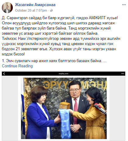 Шинээр томилогдсон Эрүүл мэндийн сайд Д. Сарангэрэлд Эрүүл мэндийн дэд сайд асан Ж. Амарсанаа цахим хуудсаараа дамжуулан зөвлөгөө өгчээ.