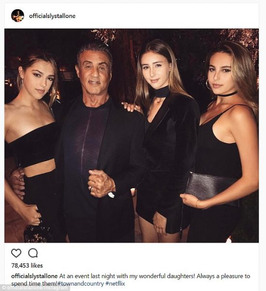 “Rocky” киноны од, өдгөө 71 настай Сильвестр Сталлоне гурван охинтой бөгөөд тэднийг Софиа(21), Систинь(19), Скарлэт(15) гэдэг. Өнгөрөгч бямба гаригийн орой Лос-Анджелест болсон “Town & Country” партинд үзэсгэлэнт гурван охиныхоо хамт ирж олны нүдийг хужирлалаа. Сильвестр “Би охидтойгоо чөлөөт цагаа хамт, хөгжилтэй өнгөрүүлэх дуртай” хэмээсэн.