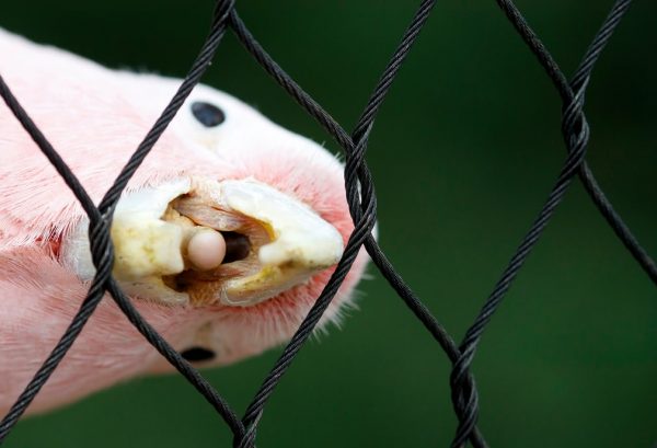 Герман, Карлсрухь. Ягаан тотьны төрлийн шувуу амьтны хүрээлэнгийн төмөр хашлаганы цаанаас харж байна.