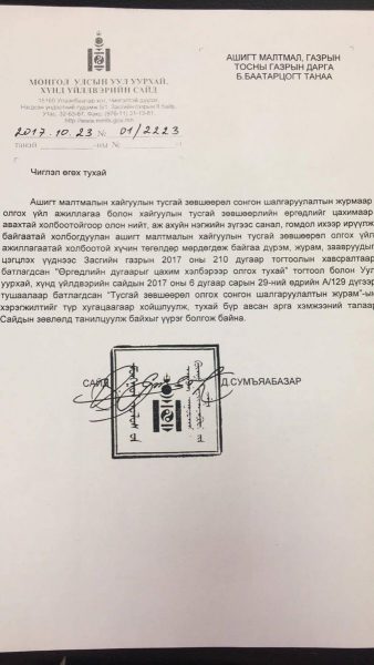Уул уурхай, хүнд үйлдвэрийн сайд Д.Сумъяабазар Ашигт малтмал, газрын тосны газрынхантай уулзан ажил байдалтай нь танилцсан. Тэр үеэрээ төрийн өмнө тангараг өргөсөн төрийн албан хаагчид шударга үнэнчээр ажиллах ёстой болохоос лиценз нэртэй алга дарам А4-ийн цаас зардаг наймаачдыг өөгшүүлсэн байдлаар ажиллаж болохгүйг хатуу анхаарууллаа. Мөн нийтээрээ нэр нь унаад байгаа салбараа өөд нь татаж, улсдаа эзэн шиг сэтгэлээр хандан ажиллах чиглэлийг өгсөн. Энэ үеэрээ журам, тогтоолын цоорхойгоор гажуудаад байгаа лиценз олголтын асуудлыг эргэн харж зөв гольдролд оруулахын тулд тушаал гаргаснаа тус газрын дарга Б.Баатарцогтод өглөө. Тогтоолд “Ашигт малтмалын хайгуулын тусгай зөвшөөрөл сонгон шалгаруулалтын журмаар олгох үйл ажиллагаа болон хайгуулын тусгай зөвшөөрлийн өргөдлийг цахимаар авахтай холбоотойгоор олон нийт, аж ахуйн нэгжийн зүгээс санал, гомдол ихээр ирүүлж байгаа. Үүнтэй холбогдуулан ашигт малтмалын тусгай зөвшөөрөл олгох үйл ажиллагаатай холбоотой хүчин төгөлдөр мөрдөгдөж байгаа дүрэм, журам, заавруудыг цэгцлэх шаардлага тулгарсан.