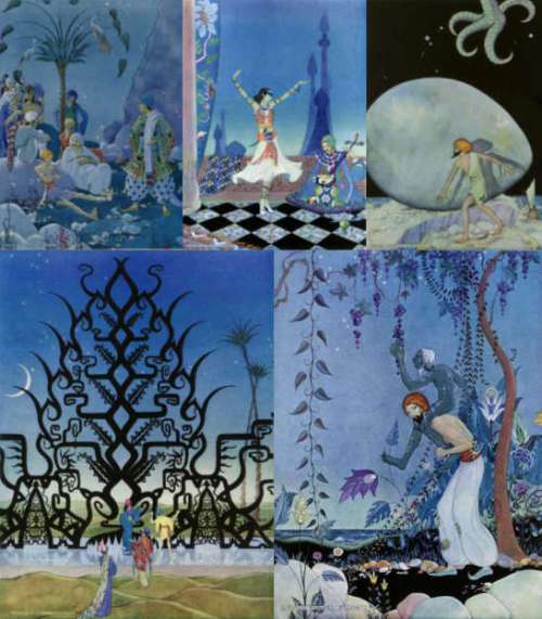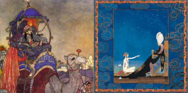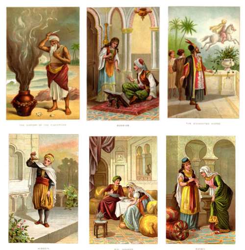 Үлгэрүүдийн уг цогцолборыг мөн “Арабын шөнүүд” ч гэж нэрлэдэг. Доторх утга, агуулга болон түүх шастир, соёл уламжлалыг багтааж, оюуны их ундрагыг шингээснээрээ уг бүтээл хүн төрөлхтний хамгийн их нөлөөтэй бүтээлүүдийн нэгд зүй ёсоор ордог билээ. Дээрх зургийг 19-р зуунд зурсан. Үүний зарим хэвлэлтийн зураачдаас дурдвал Виржиниа Францэс хэмээх 1900 онд төрж 31-хэн насыг насалсан зураач бүсгүй амьдралынхаа хугацаанд гуравхан номны зургийг зурсан байдгийн нэг нь тэр үед хэвлэгдсэн “1001 шөнийн үлгэр” ном юм.