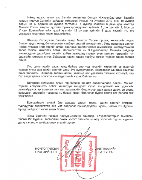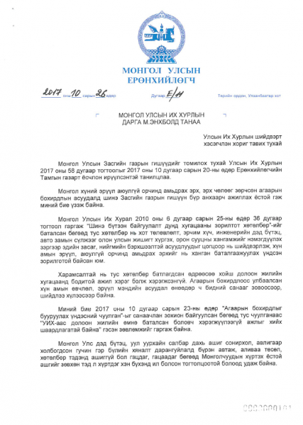 Уг албан бичигт “Монгол Улсын Засгийн газрын гишүүдийг томилох тухай Улсын Их Хурлын 2017 оны 58 дугаар тогтоолыг 2017 оны 10 дугаар сарын 20-ны өдөр Ерөнхийлөгчийн Тамгын газарт ёсчлон ирүүлсэнтэй танилцлаа.