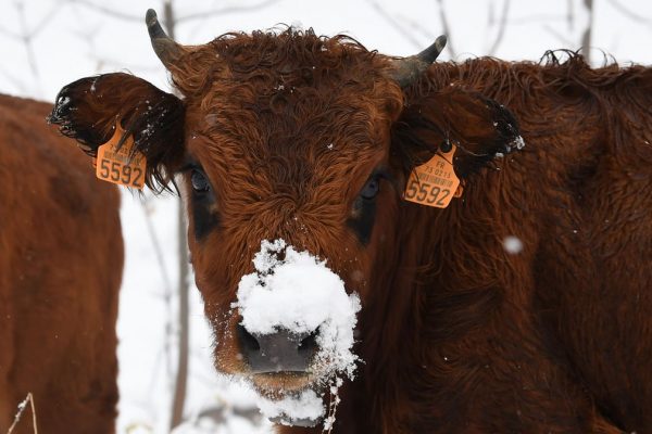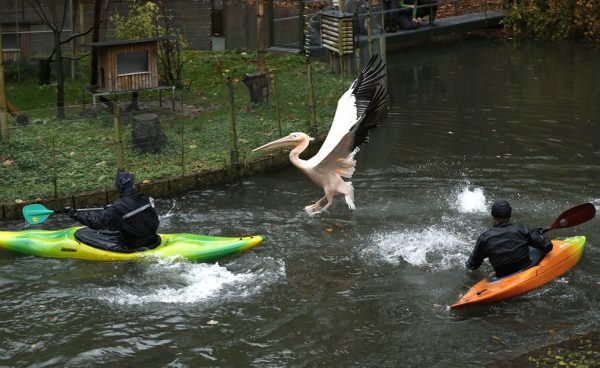 Амьтны хүрээлэнгийн ажилчид хотон шувууг өвлийн хашаанд нь хийхээр оролдож байна.