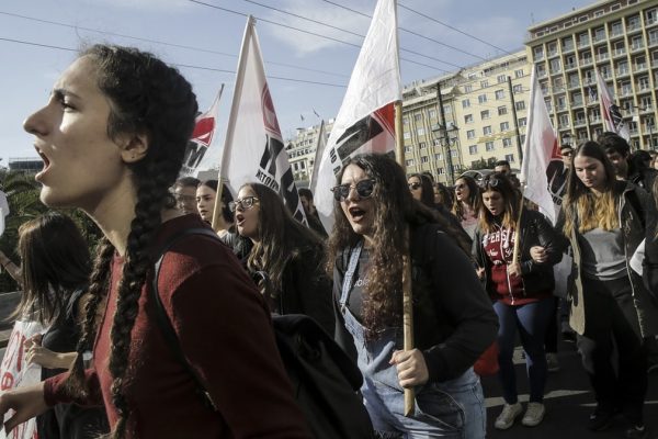 Сурагчид боловсролын системийг эсэргүүцэж парламентын ордны өмнө жагсаал хийж байна.