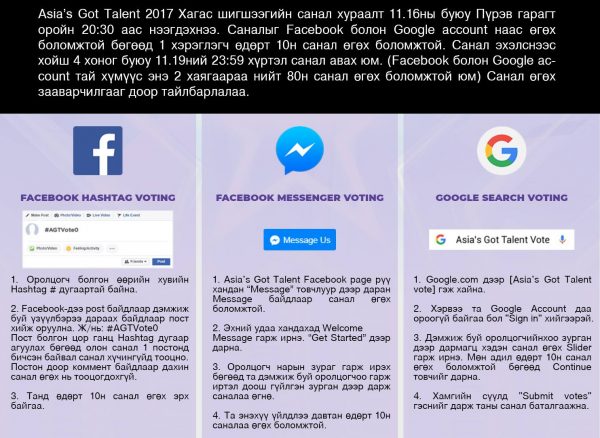 Энэ талаар тэрбээр өөрийн цахим хуудаснаа “Asia’s Got Talent 2017 хагас шигшээгийн санал хураалт 11 дүгээр сарын 16 буюу пүрэв гарагт оройн 20:30 аас нээгдэнэ. Саналыг Facebook болон Google Account -наас өгөх боломжтой бөгөөд нэг хэрэглэгч өдөрт 10-н санал өгөх боломжтой. Санал эхэлснээс хойш дөрөв хоног буюу 11 дүгээр сарын 19-ний 23:59 цаг хүртэл санал авах юм. (Facebook болон Google acc тай хүмүүс энэ хоёр хаягаараа нийт 80-н санал өгөх боломжтой юм.) Санал өгөх зааварчилгааг доорх зурган дээр тайлбарлалаа” хэмээн бичжээ.