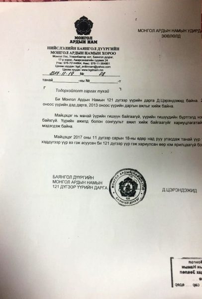 Иргэн Г.Майцэцэг нь Нийслэлийн Баянгол дүүргийн Монгол Ардын Намын 121 дүгээр үүрт огт харьяалагддаггүй болохыг үүрийн дарга Д.Цэрэндэжидийн албан бичгээр баталгаажуулсан байна.