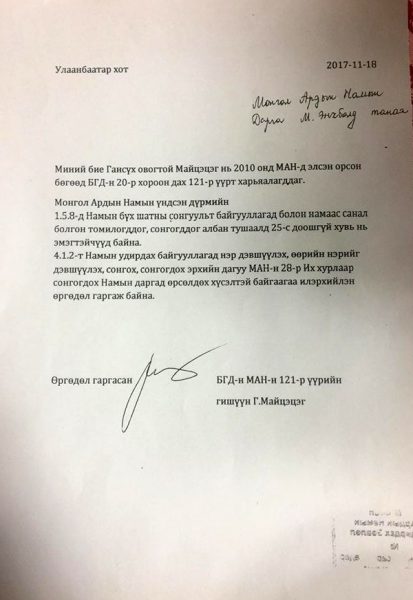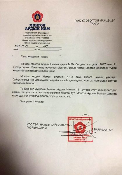 Уг албан бичигт “Танаас 2017 оны 11 дүгээр сарын 18-ны өдөр ирүүлсэн Монгол Ардын Намын даргад өрсөлдөх тухай хүсэлтийг хүлээн авч судлан үзлээ. Монгол Ардын Намын дүрмийн 4.1.2 дахь хэсэгт намын удирдах байгууллагад нэр дэвшүүлэх, өөрийн нэрийг дэвшүүлэх, сонгох, сонгогдох эрхтэй гэж заасан байдаг. Та Баянгол дүүргийн Монгол Ардын Намын 121 дүгээрт харьяалагддаг намын гишүүн гэдэг нь тогтоогдохгүй байгаа тул Монгол Ардын Намын даргад өрсөлдөх эрх үүсэхгүй байгааг үүгээр мэдэгдье” гэжээ.